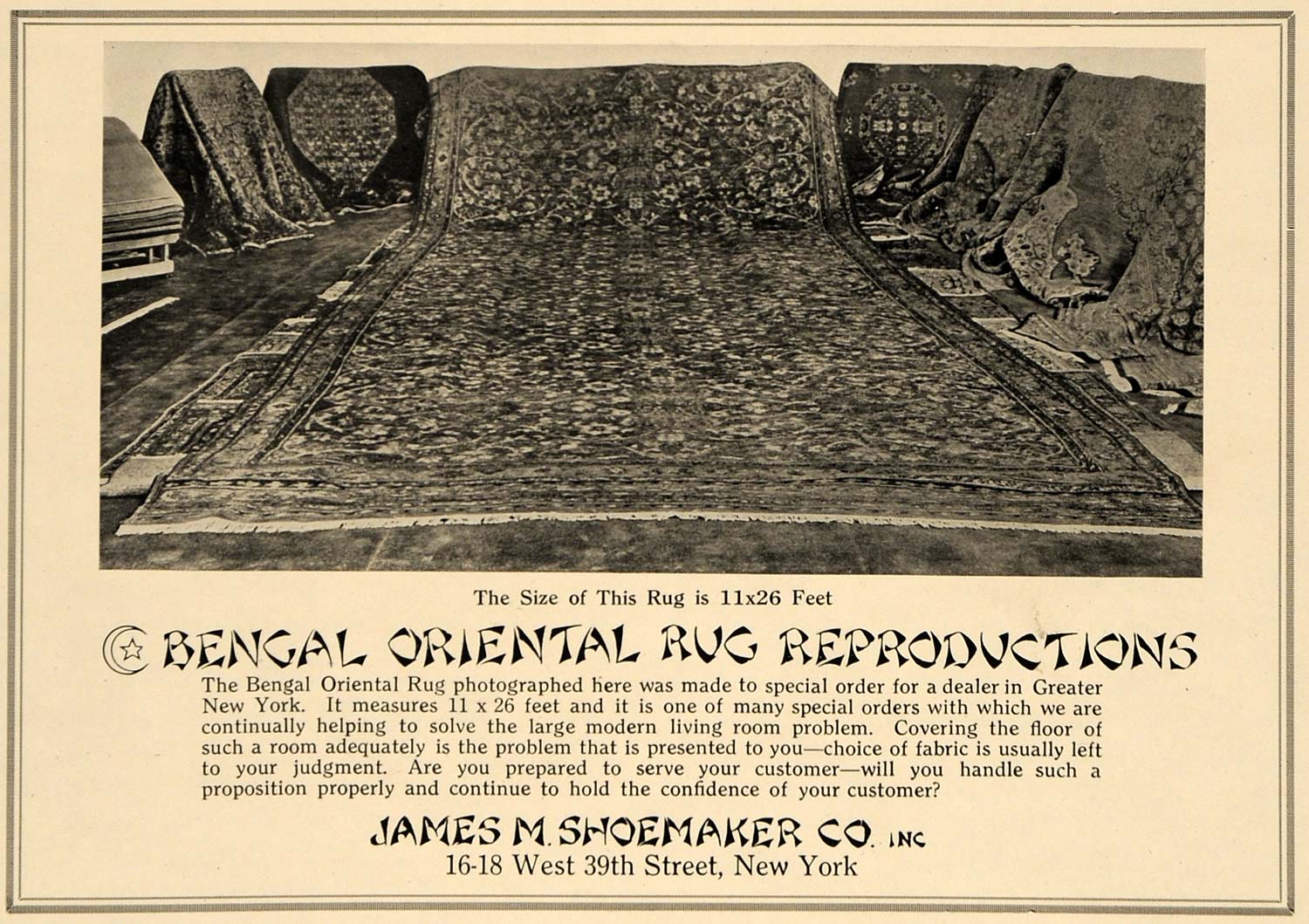 This is an original 1919 black and white print ad for Bengal Oriental Rug Reproductions, a product by James M. Shoemaker Company, located at 16-18 West 39th Street in New York.