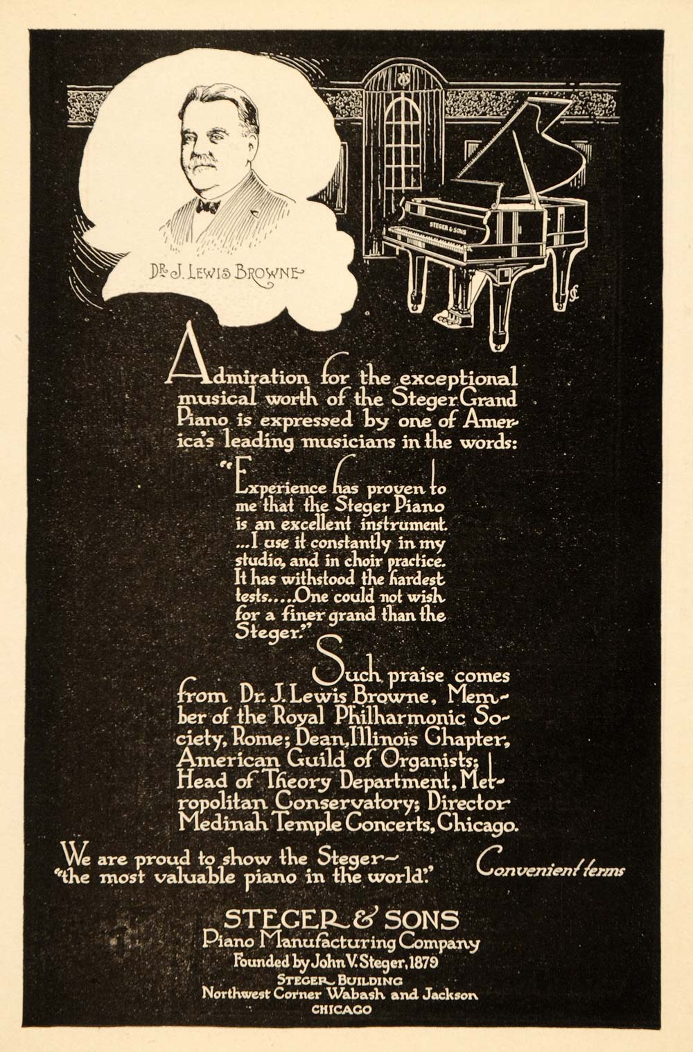 This is an original 1919 black and white print ad for pianos from Steger and Sons of Chicago, Illinois. The ad features a quote from Dr. J. Lewis Browne of the Royal Philharmonic Society.