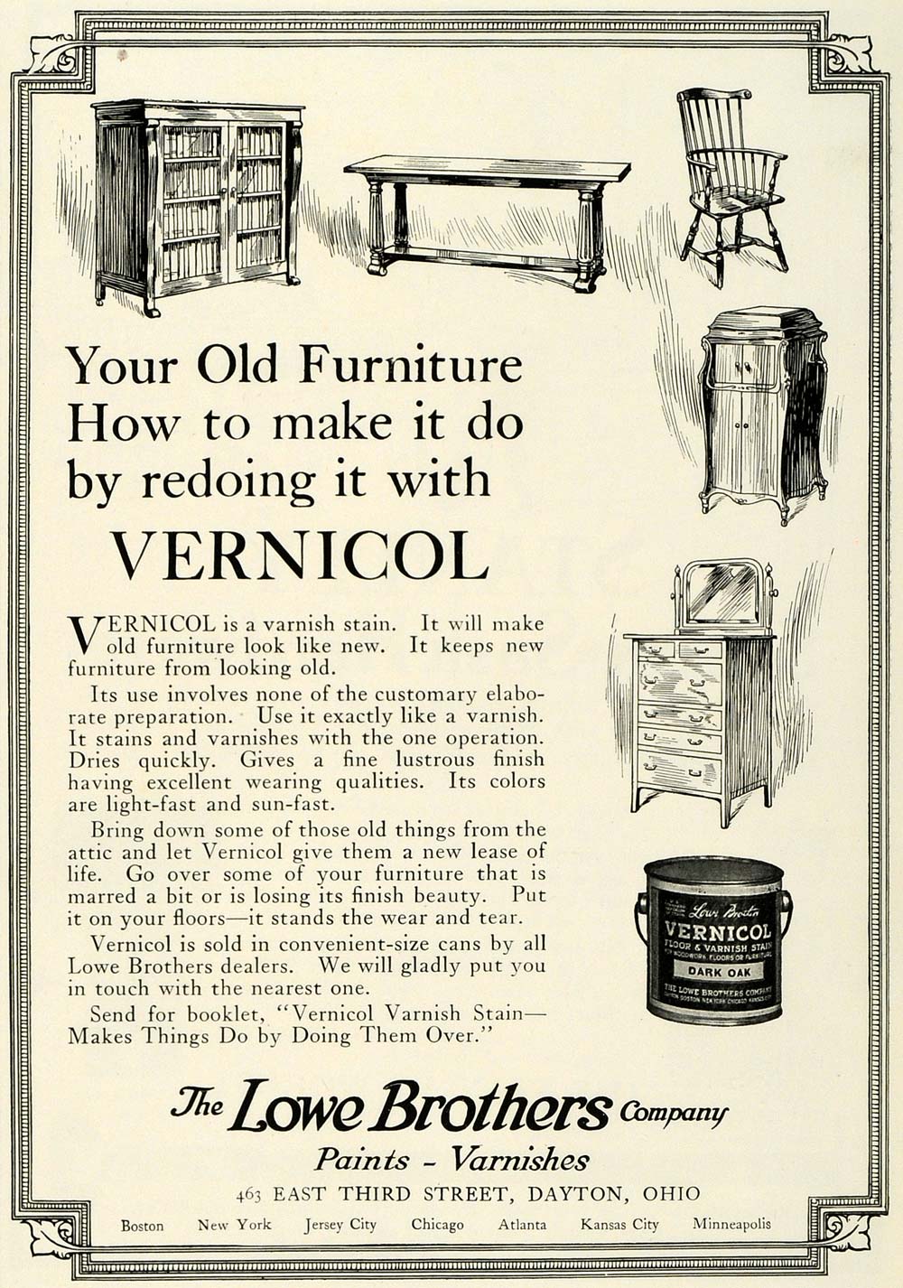 This is an original 1919 black and white print ad for The Lowe Brothers Company's line of Vernicol varnish stain for furniture.