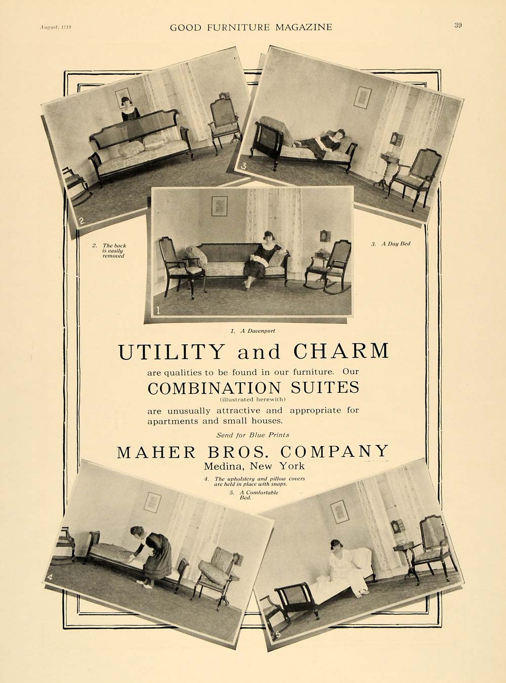 This is an original 1919 black and white print ad promoting furniture from Maher Bros. Company located in Median, New York.