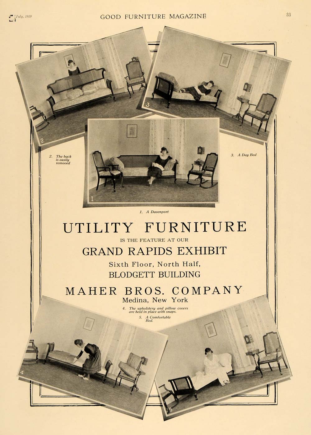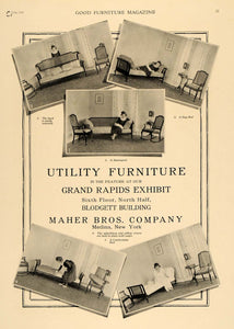 This is an original 1919 black and white print ad for the Maher Bros. Company of Medina, New York. This ad displays their Utility Furniture, which is the exciting feature at the Grand Rapids Exhibit on the North Half of the Sixth Floor of the Blodgett Building.