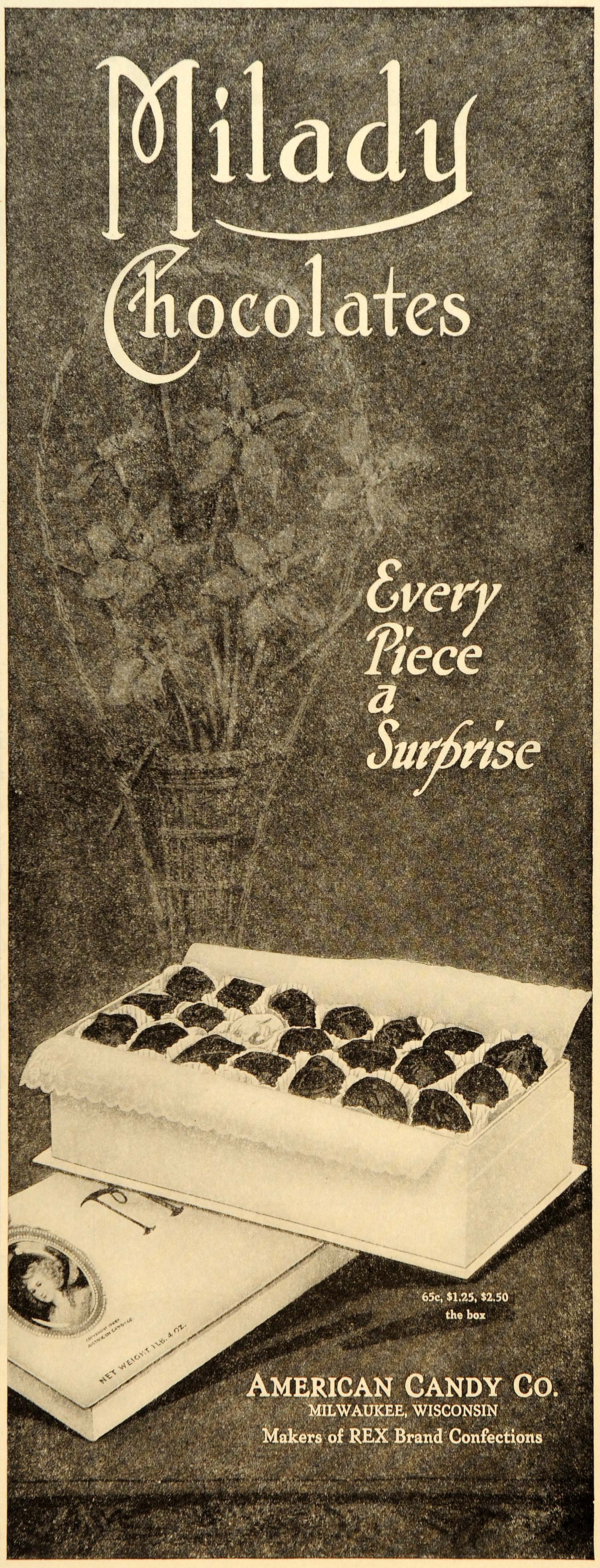 Keywords specific to this image: Milwaukee, Confections, Pricing, Net Weight, Box of Chocolates Vintage Advertising