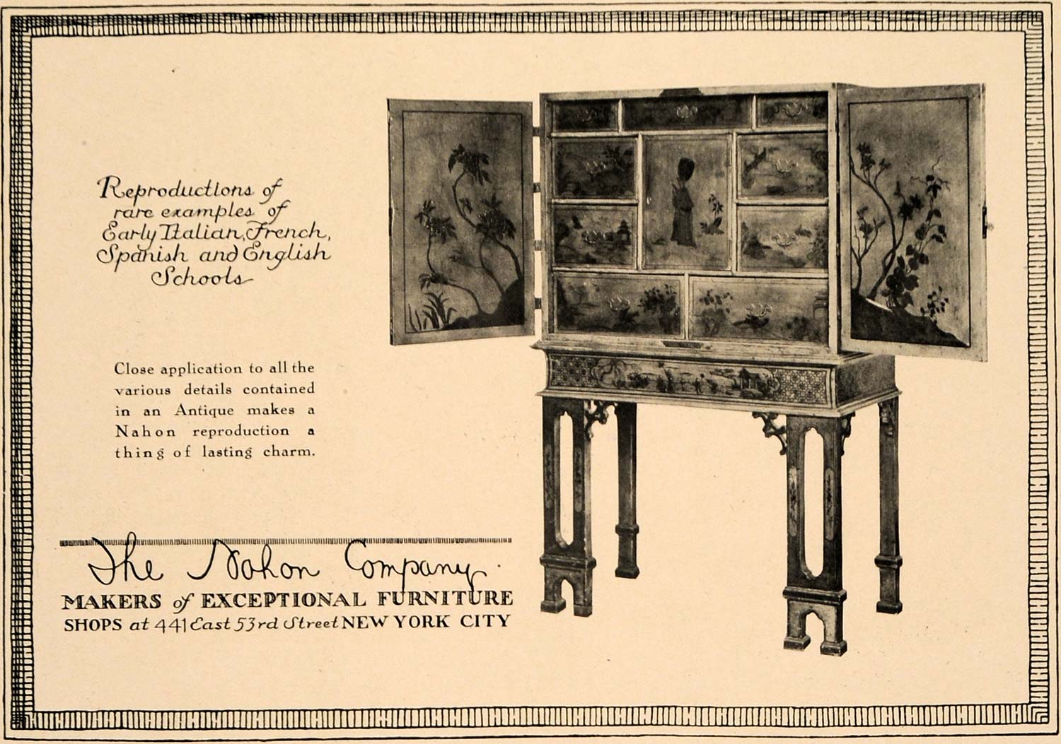 This is an original 1919 black and white print ad for the reproduction of rare examples of Early Italian, French, Spanish and English furniture from Nahon Company located at 441 East 53rd Street, New York City, New York.