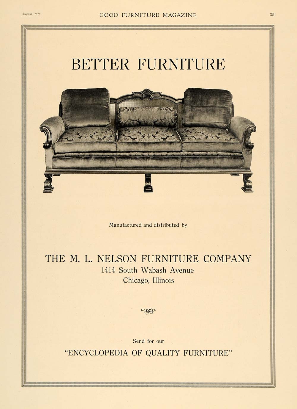 This is an original 1919 black and white print ad for the M. L. Nelson Furniture Company located at 1414 South Wabash Avenue, Chicago, Illinois.