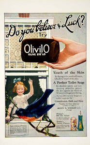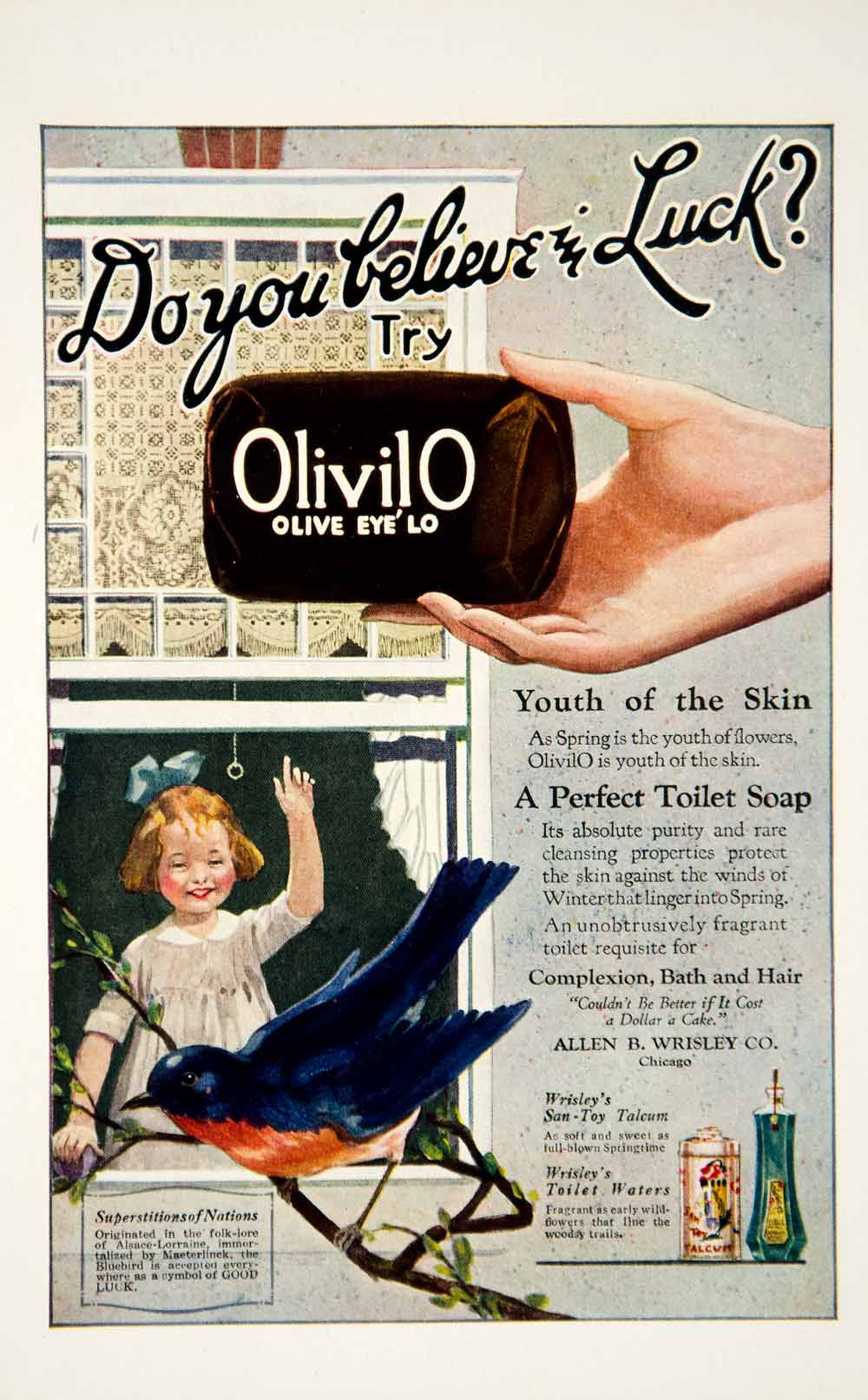 This is an original 1919 color print ad for OlivilO Soap, Wrisley's San-Toy Talcum, and Wrisley's Toilet Waters that were made and sold by the Allen B. Wrisley Co. of Chicago, Illinois (IL).