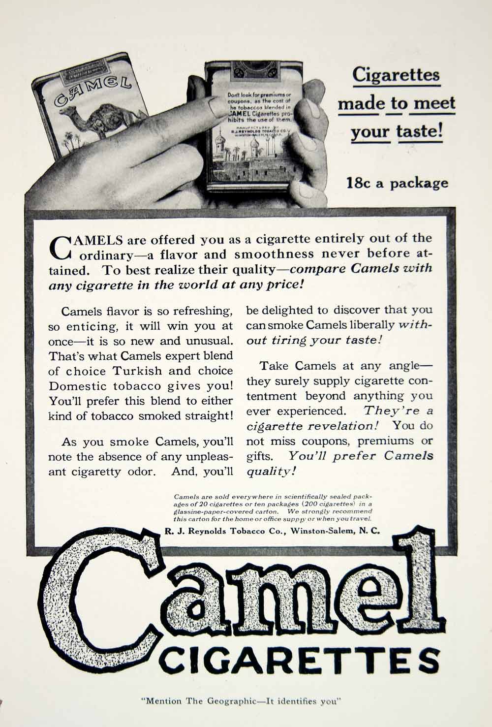 This is an original 1919 black and white print ad for the R.J. Reynolds Tobacco Company, featuring their Camel Cigarettes, which claim to be "made to meet your taste".