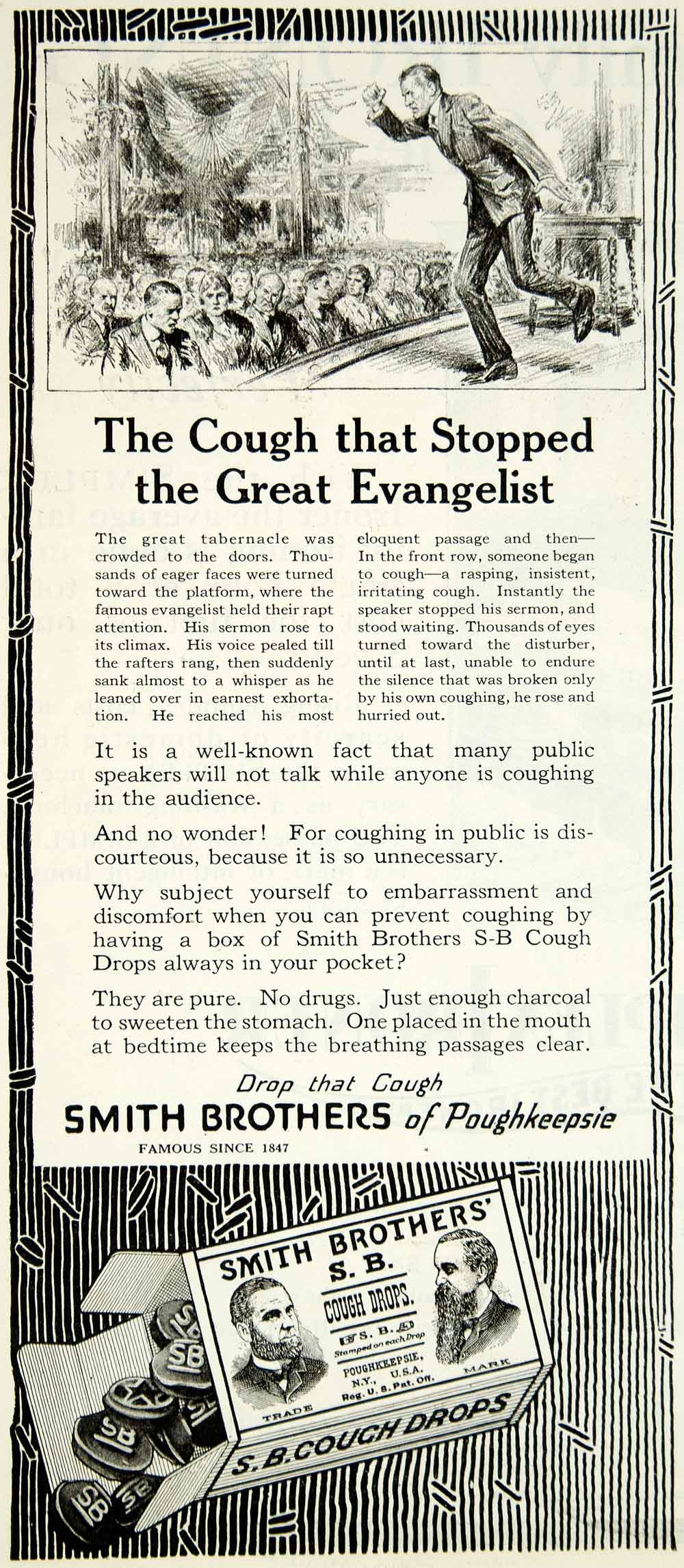 Keywords specific to this image: Vintage Advertising, S.B., Bros., Medicine, Health, Sickness, Ailment, Box, Label, Packaging, Portrait, Beard, Stage, Orator, Speech, Sermon, Religion, Tabernacle, Platform, Crowd, Audience, Pharmacy, Drugs, Treatment, Company, New York