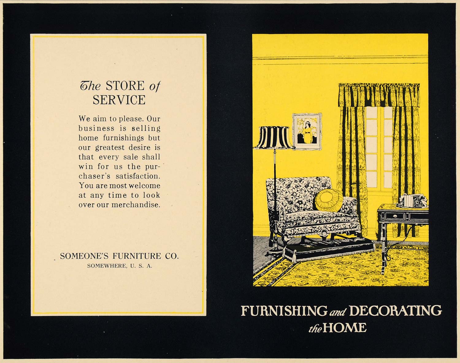 This is an original 1919 color print ad for Someone's Furniture, located in Somewhere, U.S.A. This appears to be a very interesting and cheeky mock ad for Good Furniture Magazine to encourage advertising in their publication.