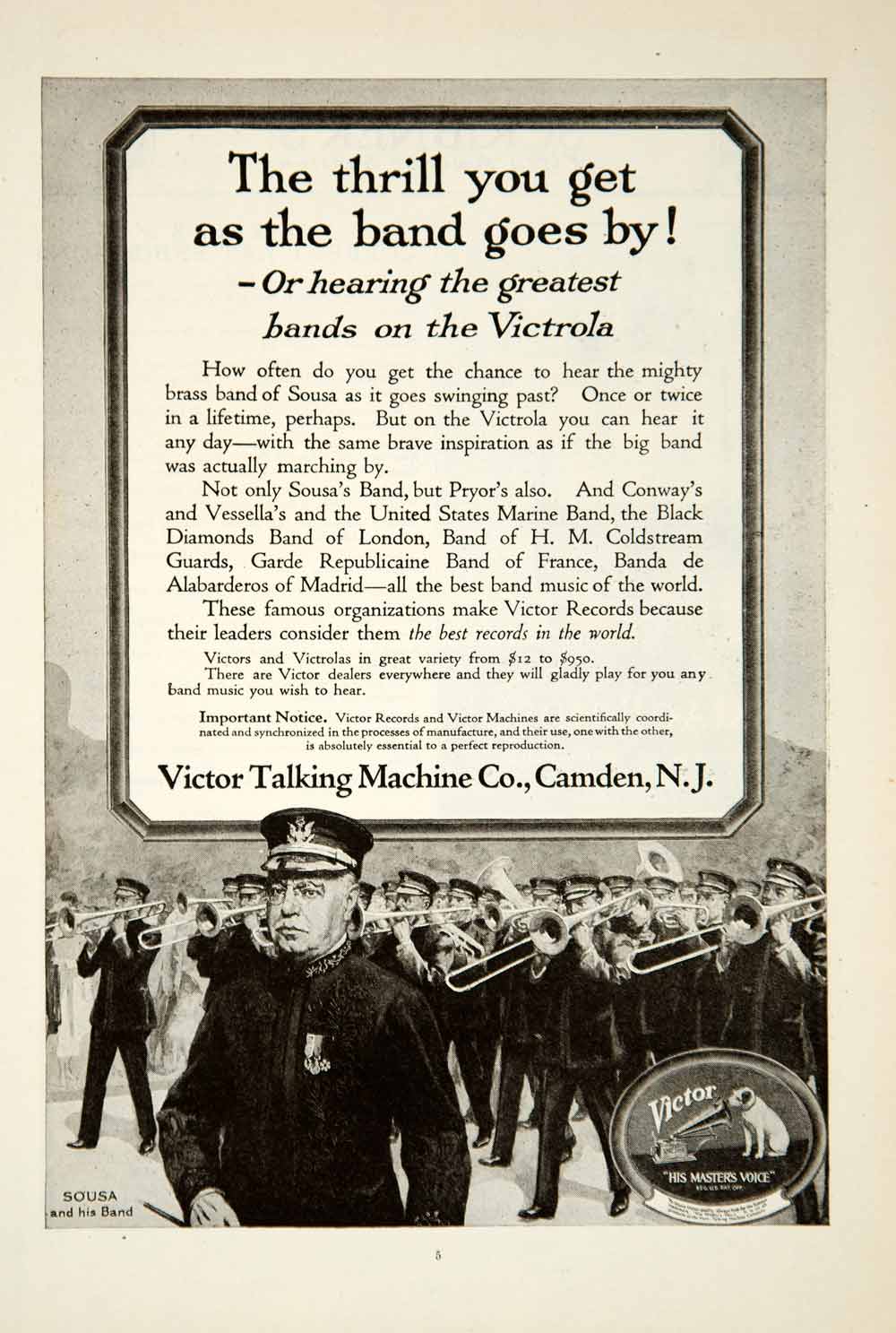 This is an original 1919 black and white print ad for the Victrola record players that were made and sold by the Victor Talking Machine Co. of Camden, New Jersey. The ad also features an illustration of American composer and conductor, John Philip Sousa, and his marching band.