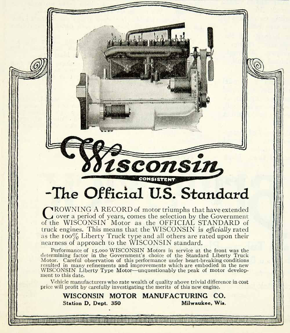This is an original 1919 black and white print ad for the Liberty type truck engine model that was made and sold by the Wisconsin Motor Manufacturing Company of Milwaukee, WI.