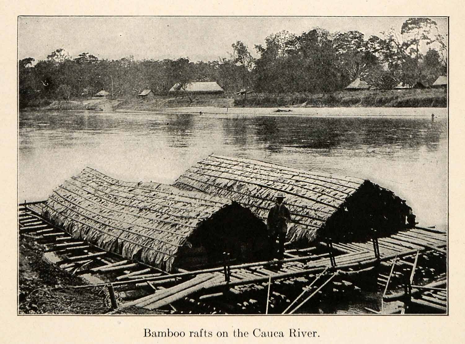 This is an original 1919 black and white halftone print of two bamboo rafts built on the Cauca River in Cauca, Colombia.