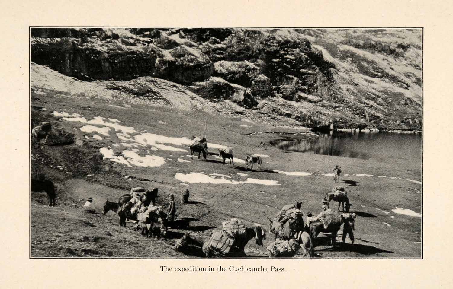 This is an original 1919 black and white halftone print of an expedition team in the Cuchicancha Pass of Lima, Peru.