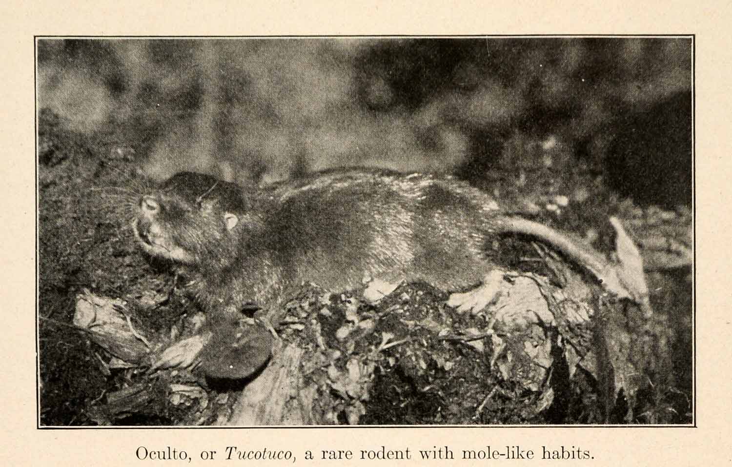 This is an original 1919 black and white halftone print of an oculto, more commonly a tuco-tuco from the Peruvian Andes. A small rodent with over 100 variations, this creature can only be found in South America and plays a very important role in the Andean ecosystem as pest control, food and for soil irrigation.