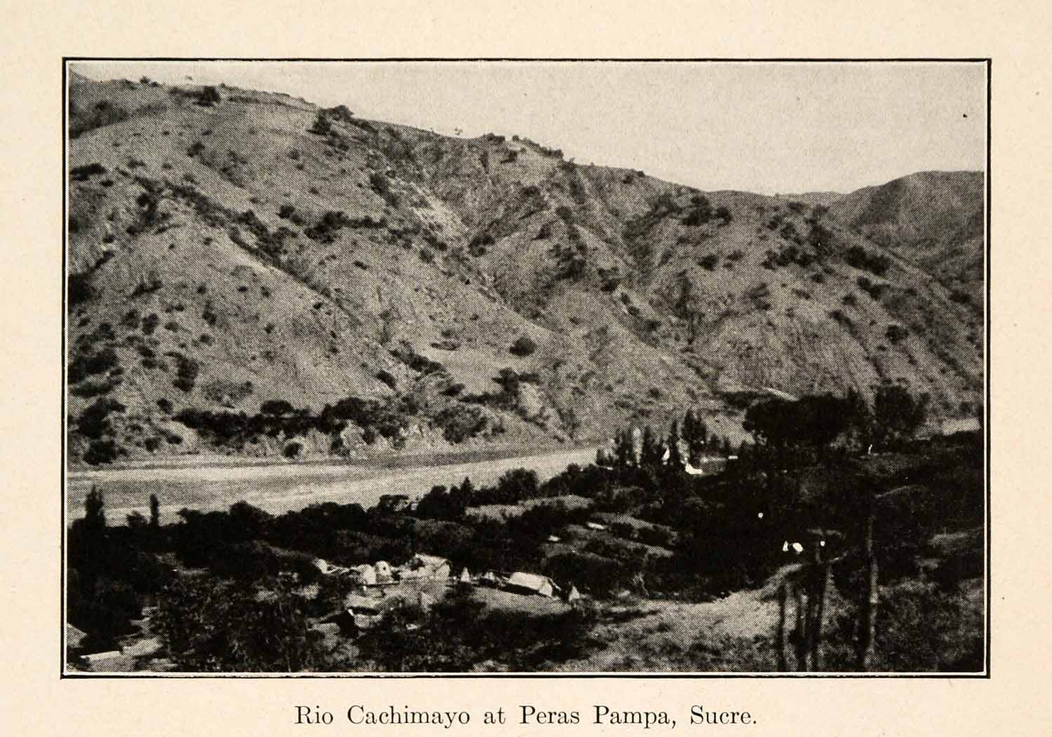 This is an original 1919 black and white halftone print of the Rio Cachimayo by the river settlement of Peras Pampa in the Sucre region of Bolivia.