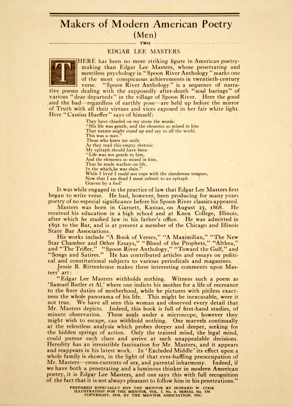 This is an original 1919 sepia photogravure portrait of the American poet and dramatist, Edgar Lee Masters (1868-1950). Please note that there is a brief descriptive text about the poet on the reverse. Please see both images.