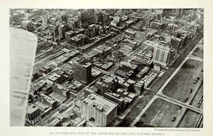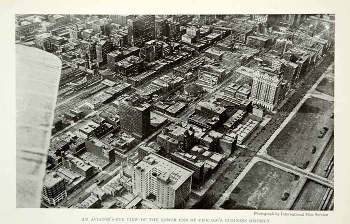 This is an original 1919 black and white halftone print of an aerial view of the lower end of Chicago's Business District.