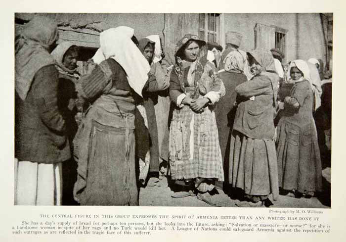 This is an original 1919 black and white halftone print of a group of Armenian women in traditional garb, during the occupation of the Turks, during which the Armenian Genocide was said to have occurred.