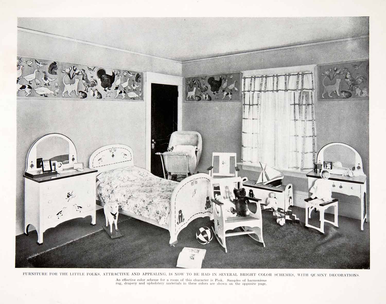 This is an original 1919 black and white halftone print of an example of an interior design plan for a child's bedroom or nursery.