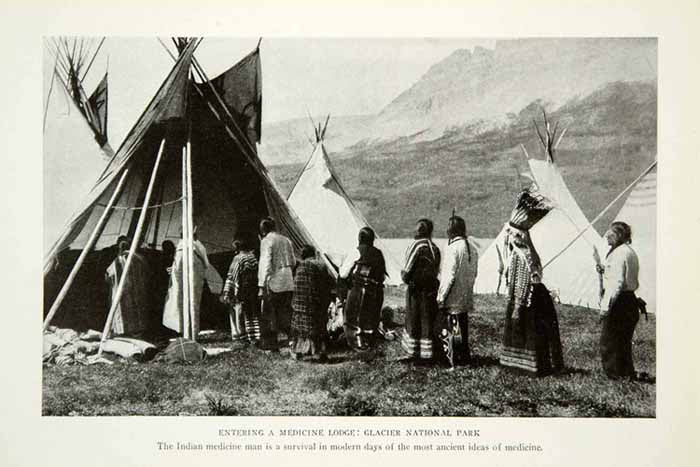 This is an original 1919 black and white halftone print of an Indian Medicine Lounge in Glacier National Park in Montana.