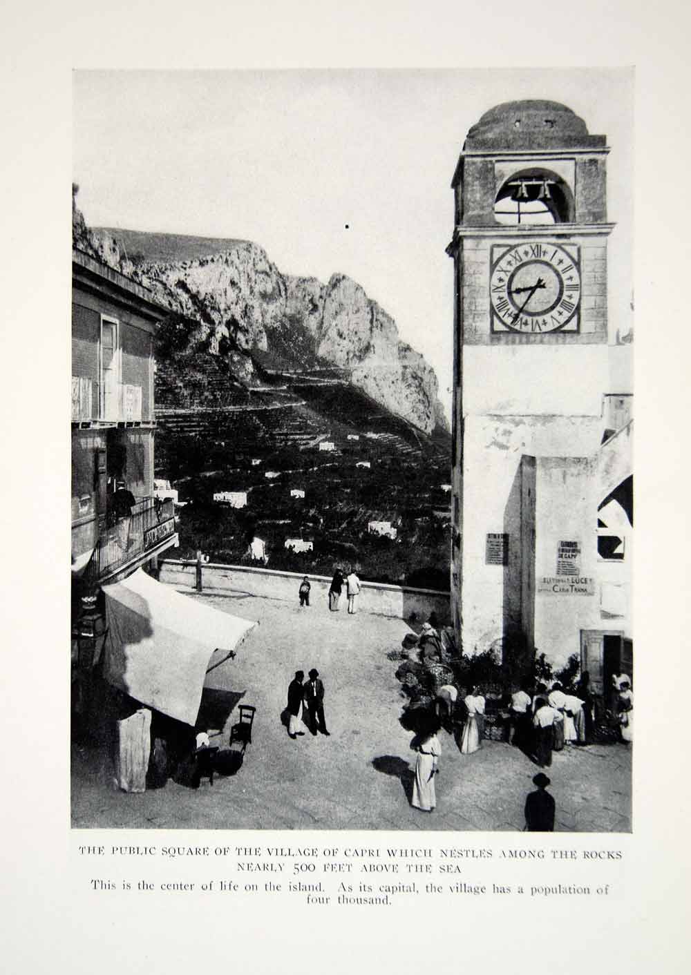 This is an original 1919 black and white halftone print of the public square in the village of Capri, found in the Tyrrhenian Sea.