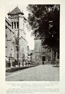 This is an original 1919 black and white halftone print of the tower of Cathedral of Saint Pierre, once lived in by John Knox.
