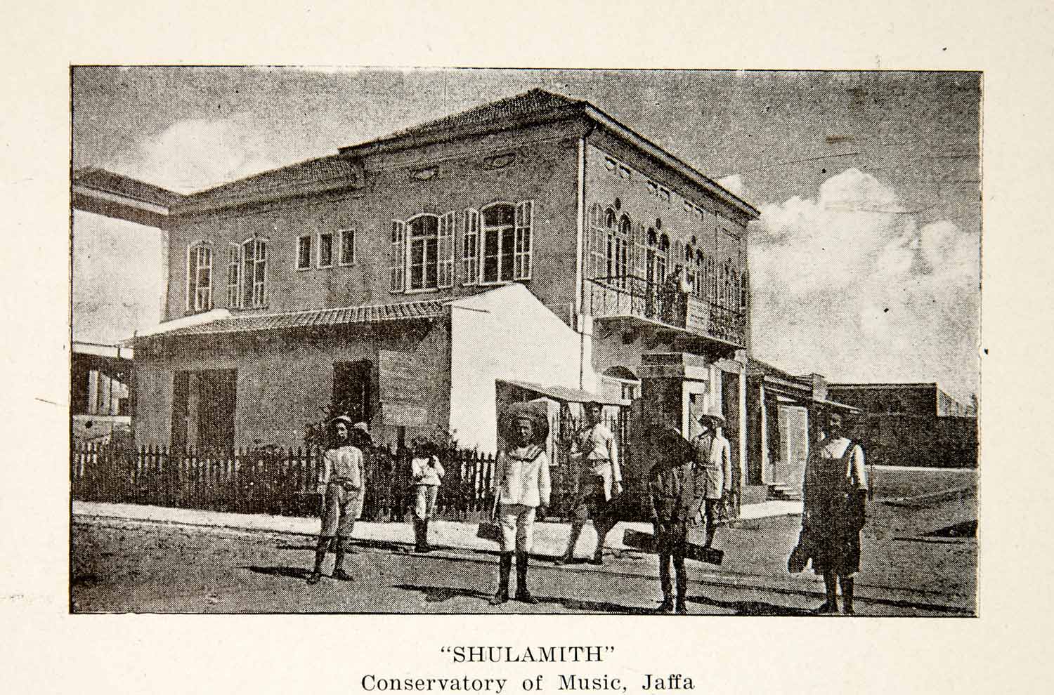 This is an original 1919 monochrome halftone print of a photo of the Shulamit Conservatory of music that was founded in 1910 in the city of Jaffa, Israel.