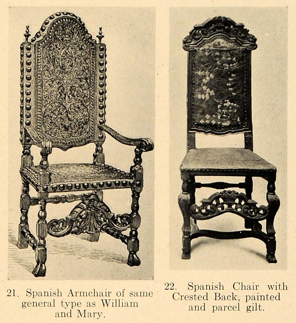 This is an original 1919 halftone print of two Spanish chairs. The chairs are very ornate and are carved and painted.