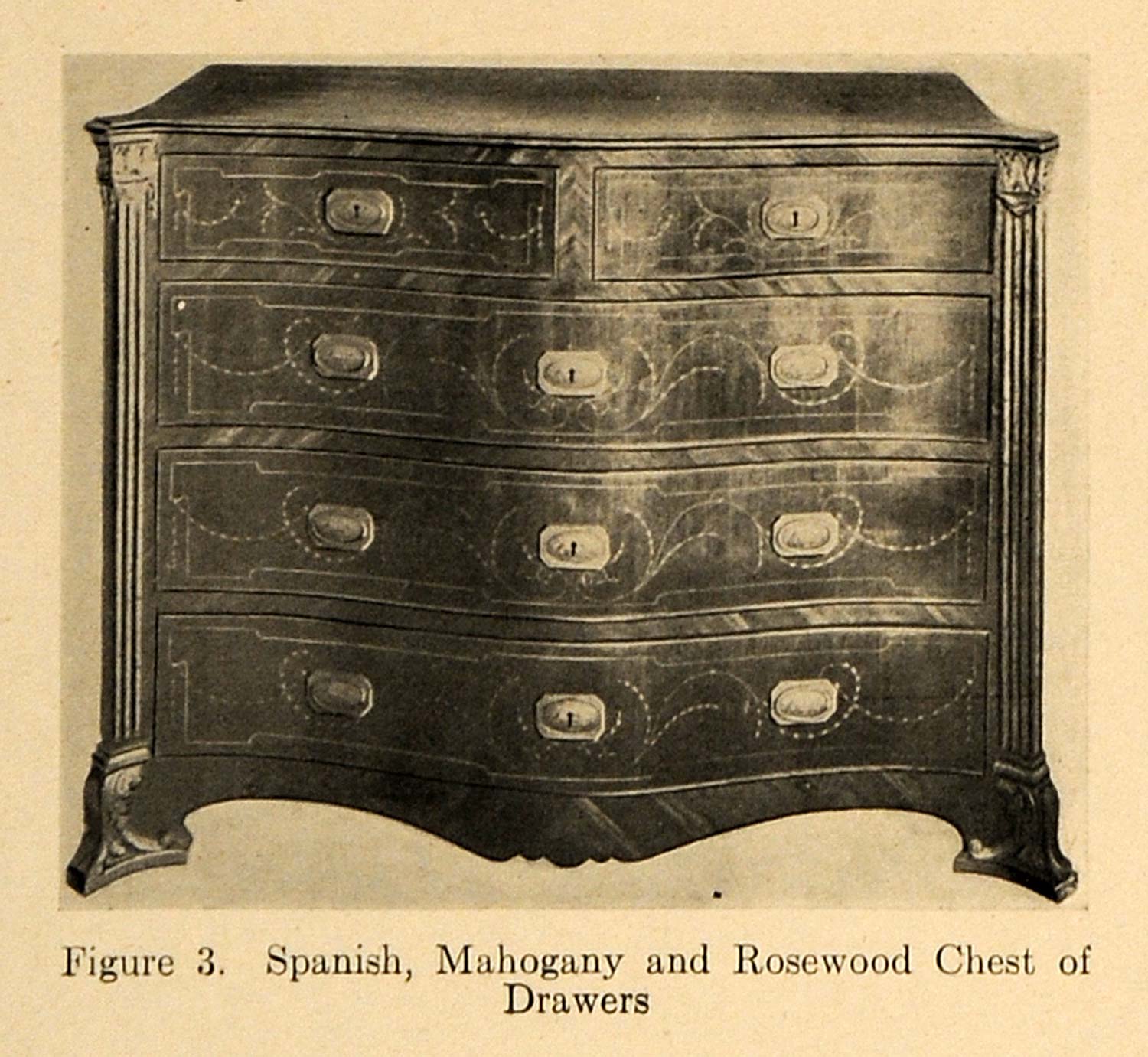 This is an original 1919 halftone print showing a Spanish, mahogany and rosewood chest of drawers.