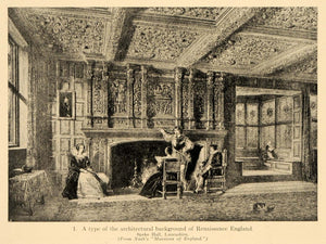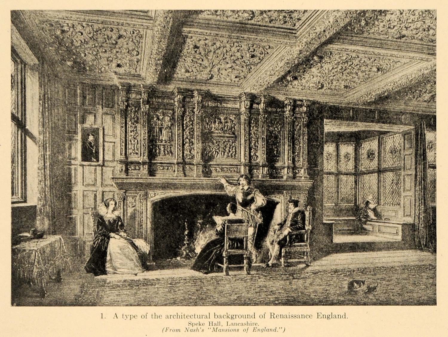 This is an original 1919 halftone print featuring an image of the Speke Hall of Lancashire from Nash's "Mansions of England," featuring the type of architectural background of Renaissance England.
