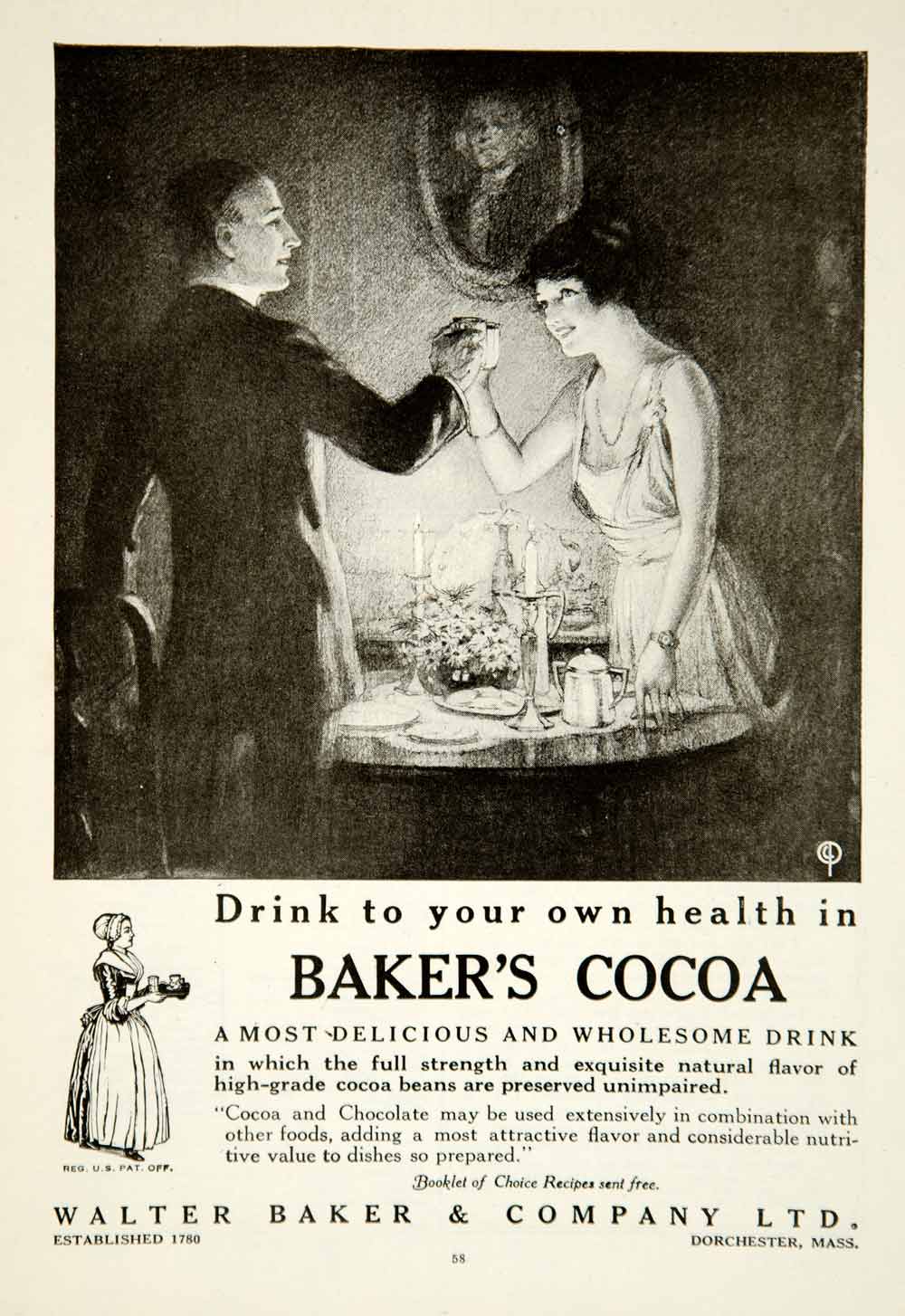 This is an original 1920 black and white print ad for Baker's Cocoa, created by Walter Baker & Company, LTD from Dorchester, Massachusetts.
