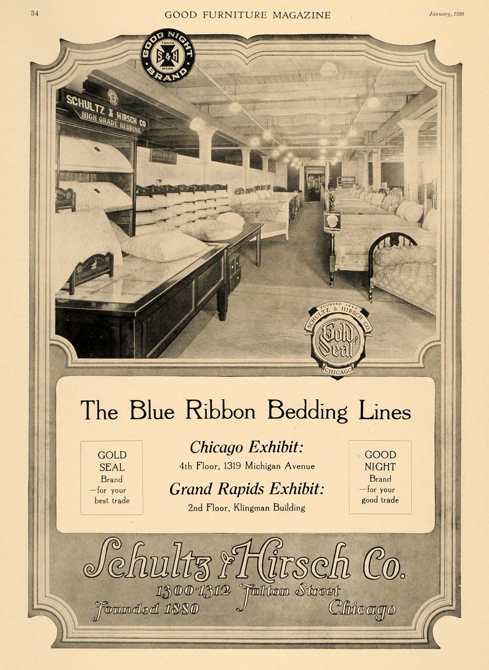 This is an original 1920 black and white print ad for Schultz & Hirsch Co. located at 1300-1312 Fulton Street in Chicago, Illinois. Promoted in the ad is The Blue Ribbon Bedding Lines: Gold Seal and Good Night exhibited in Chicago at 1319 Michigan Avenue and in Grand Rapids, Michigan at the Klingman Building.