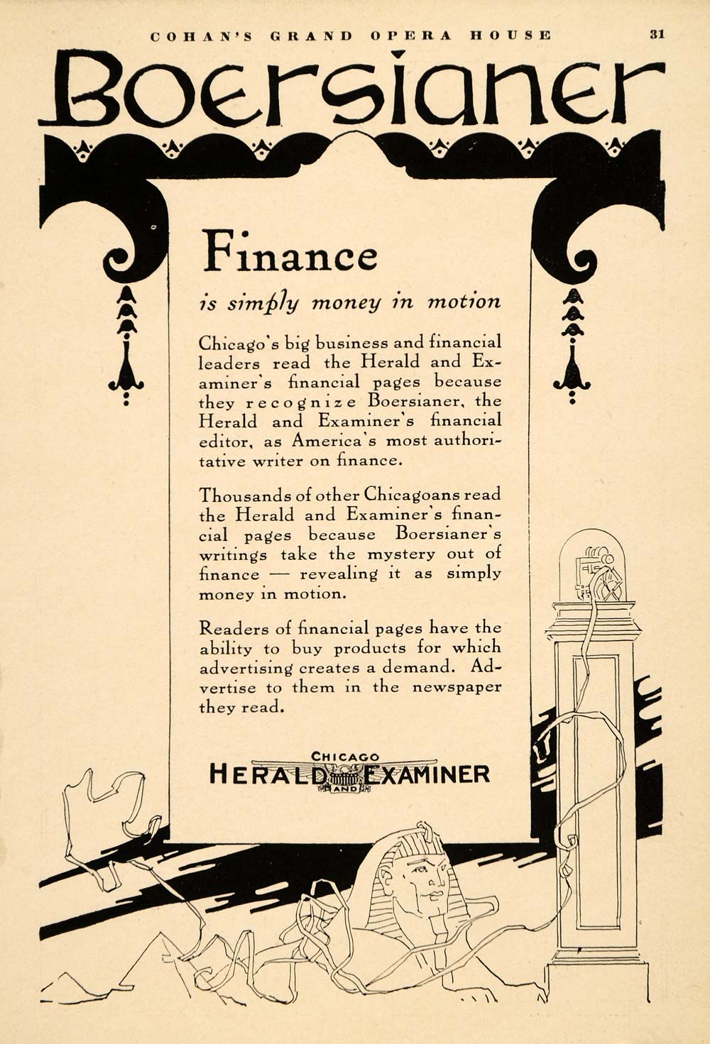 This is an original 1920 black and white print ad for the Chicago Herald and Examiner. The ad writes, "Finance is simply money in motion. Chicago's big business and financial leaders read the Herald and Examiner's financial pages because they recognize Boersianer, the Herald and Examiner's financial editor, as America's most authoritative writer on finance."