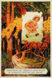 This is an ultra rare original 1920 color print ad for Schulze's Butternut Bread. The ad features an image of a woman playing a wind instrument in a forest.