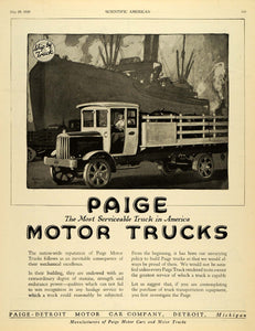 This is an original 1920 black and white print ad for the Paige Motor Trucks from Paige-Detroit Motor Car Company located in Detroit, Michigan.