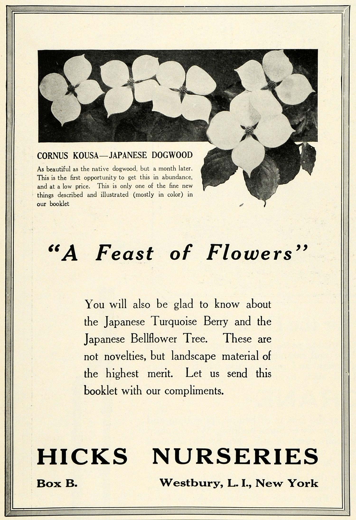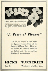 This is an original 1920 black and white print ad for the Hicks Nurseries promoting the Cornus Kousa - Japanese Dogwood flowers, located in Westbury, Long Island, New York.