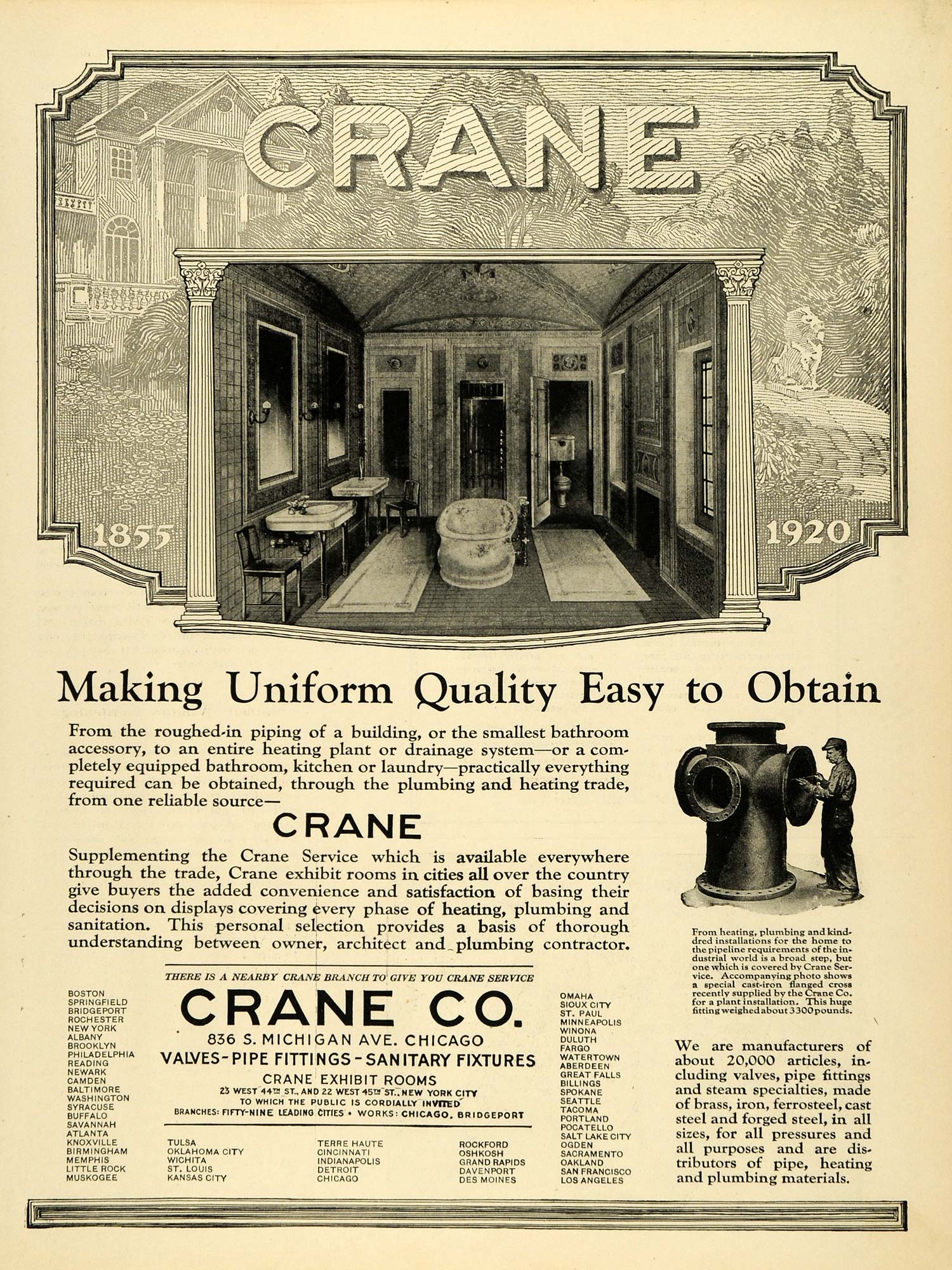 This is an original 1920 black and white print ad for the Crane Company promoting valves, pipe fittings, and sanitary fixtures, located at 836 South Michigan Avenue, Chicago, Illinois.