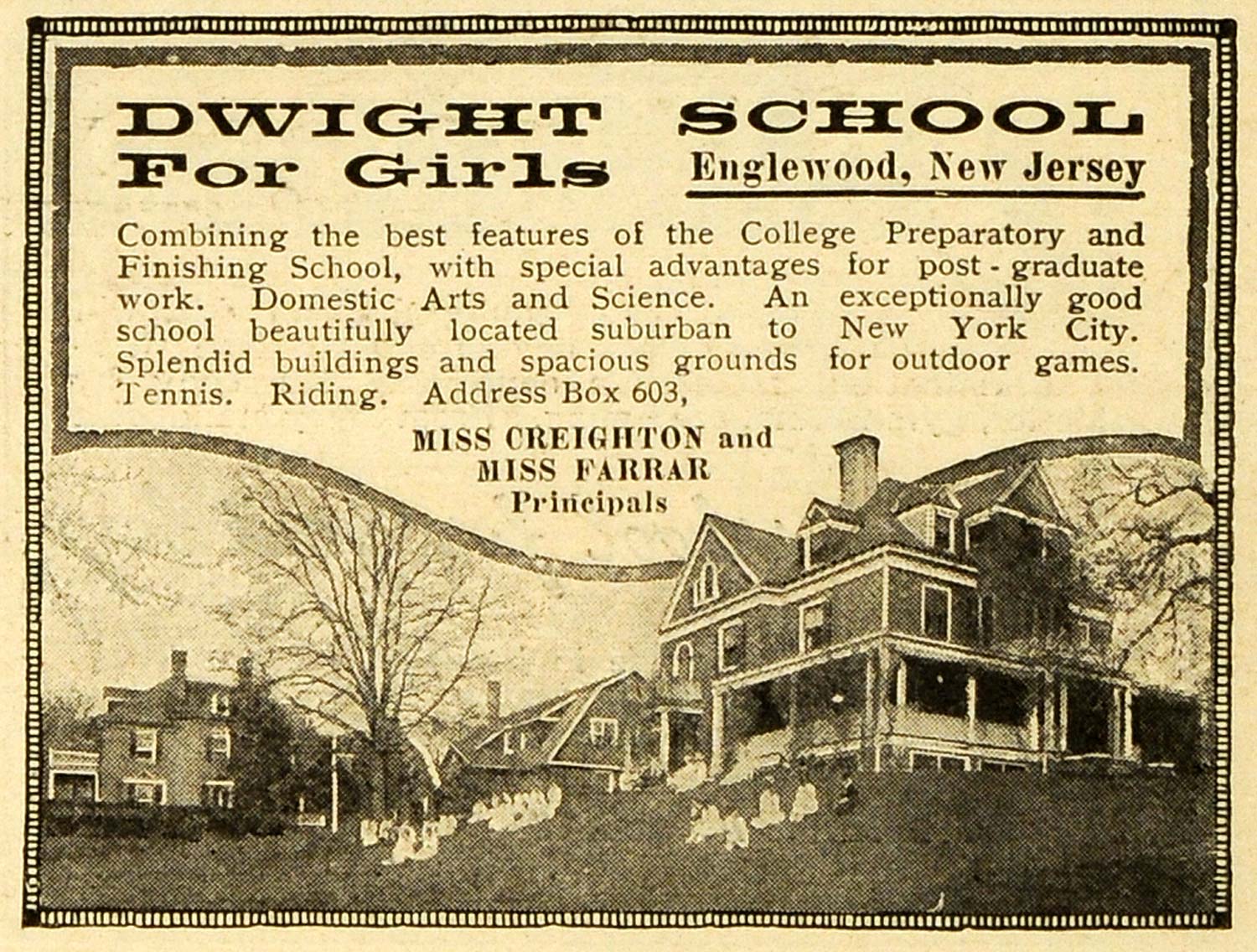 This is a small original 1920 black and white print ad for the Dwight School for girls located in Englewood, New Jersey. Principals: Creighton and Farrar.
