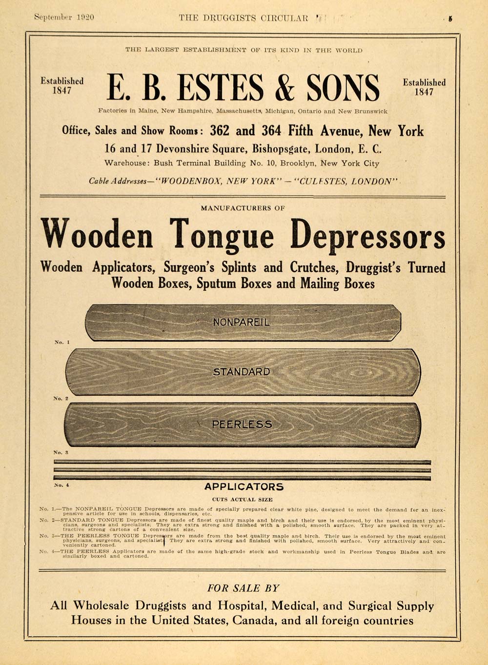 This is an original 1920 black and white print ad for E. B. Estes & Sons, whose warehouse is located in the Bush Terminal Building No. 10 in Brooklyn, New York, and whose office and salesrooms are located at 362 and 364 Fifth Avenue in New York, and 16 and 17 Devonshire Square in Bishopsgate, London. They are the manufacturers of Wooden Tongue Depressors for the doctor's office.