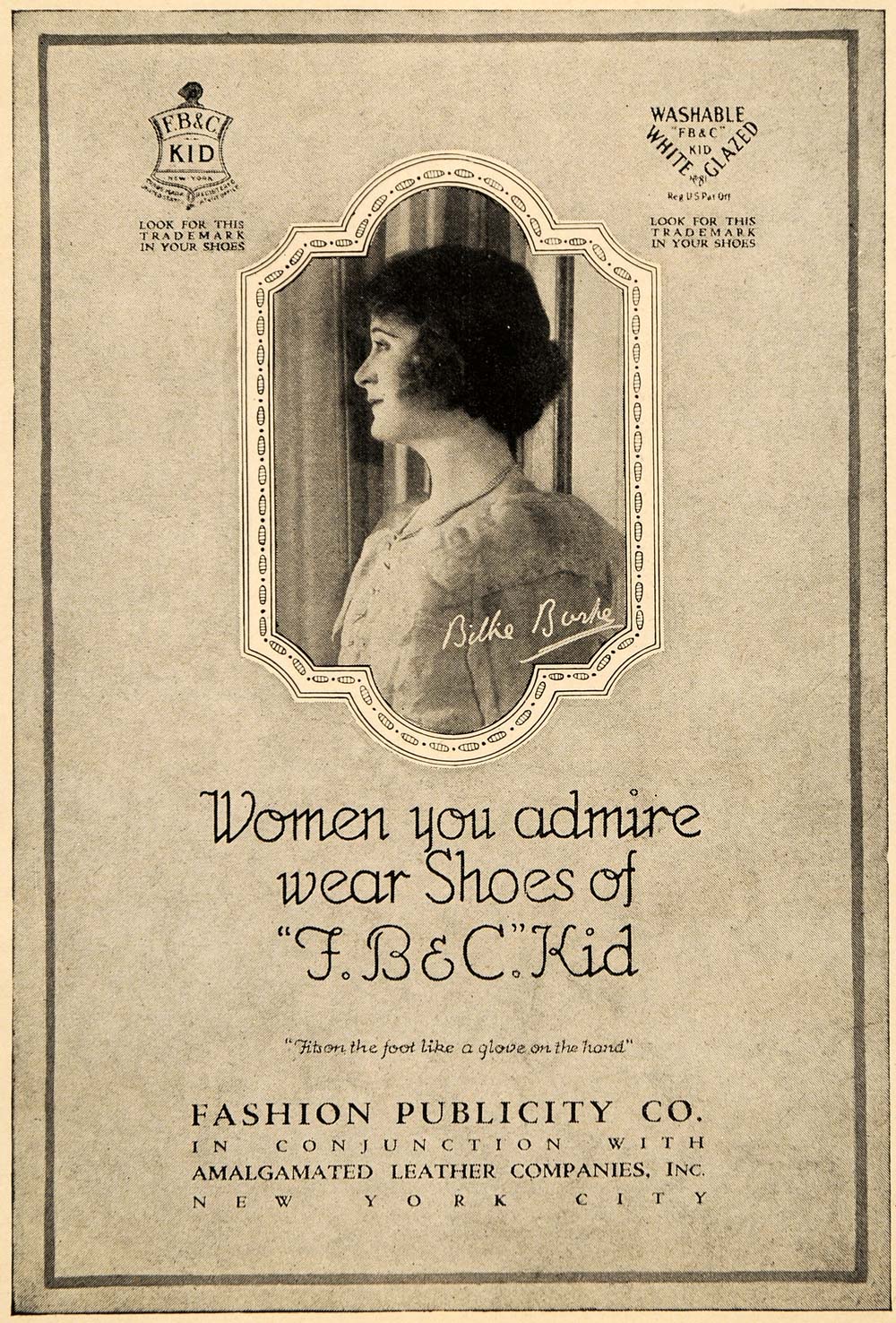 This is an original 1920 black and white print ad for the Fashion Publicity Company. The ad features an image of Billie Burke, the famous actress, known for her portrayal of Glinda the Good Witch in "The Wizard of Oz."
