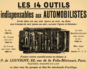 This is an original 1920 black and white print ad for a 14 piece tool kit, perfect for any motorist. This tool pouch rolled up to fit in a glove box. Louvigny, 82 Rue de la Folie-Mericourt, Paris, France.