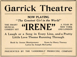 This is an original 1920 black and white print ad for "Irene" at the Garrick Theatre. The ad writes, "A laugh or a song in every line, and a pretty little love theme running through."