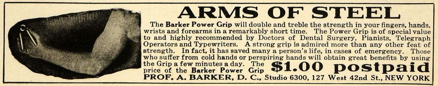 This is a tiny original 1920 black and white print ad for the Barker Power Grip from Professor A. Barker, D. C. from New York.