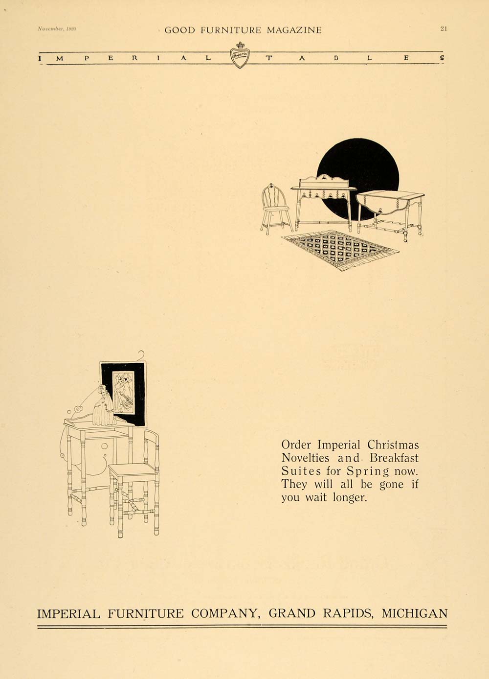This is an original 1920 black and white print ad for the Imperial Furniture Company located in Grand Rapids, Michigan.
