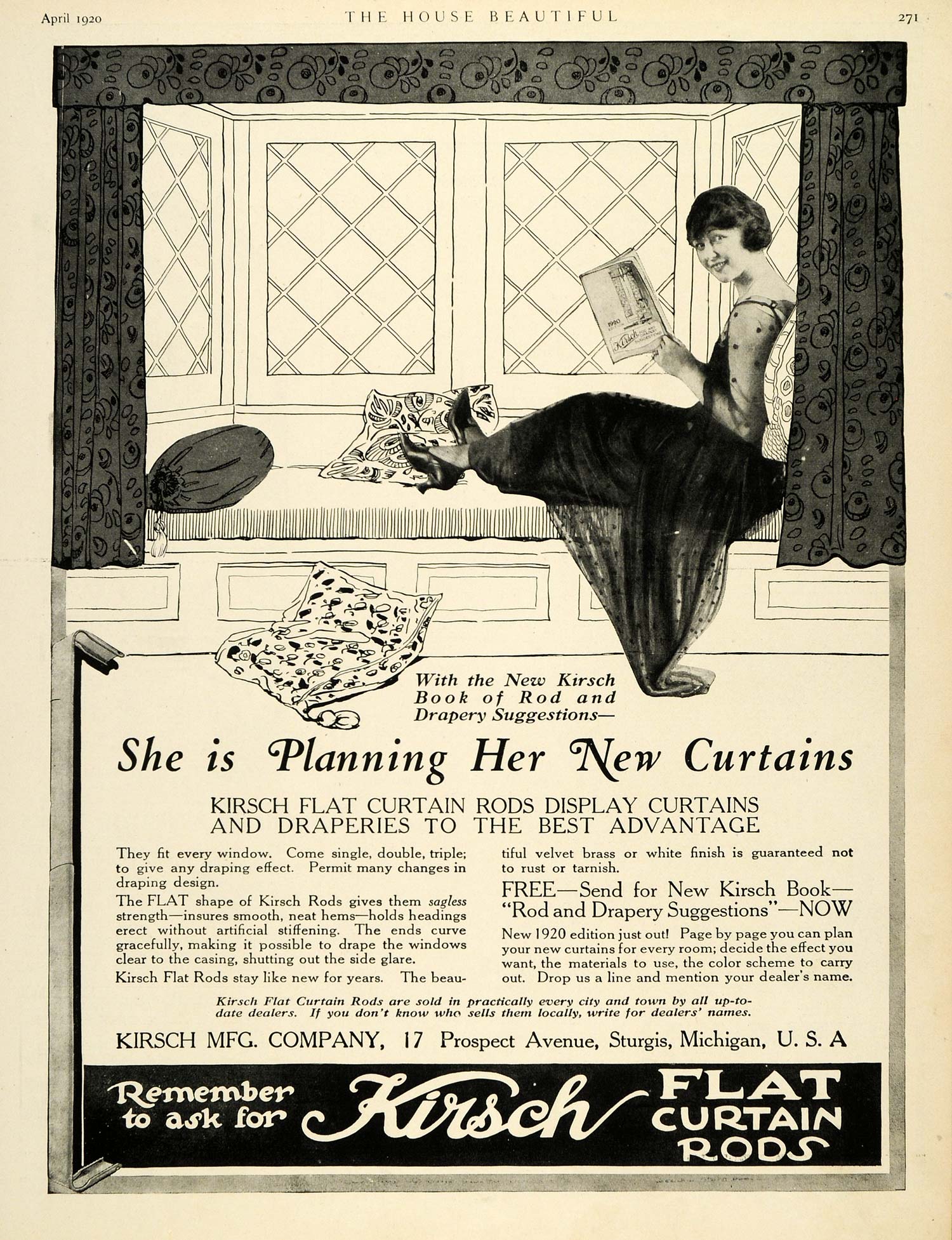 This is an original 1920 black and white print ad for the Kirsch Flat Curtain Rods from Kirsch Manufacturing Company located at 17 Prospect Avenue, Sturgis, Michigan.