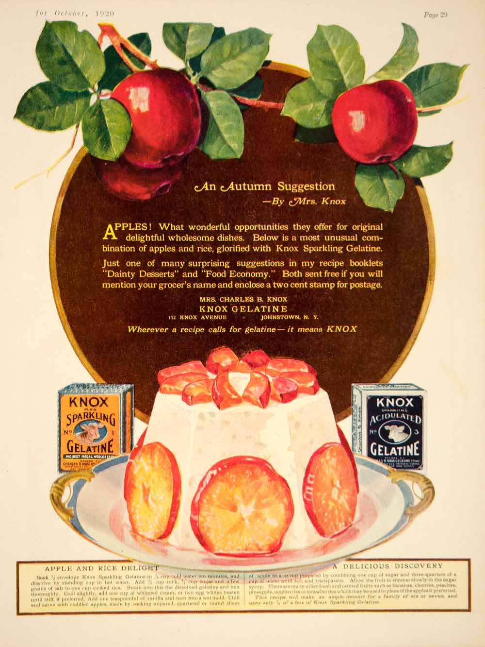 This is an original 1920 color print ad for sparkling gelatine dessert mixes that were made and sold by the Charles B. Knox Gelatine Company of 112 Knox Avenue, Johnstown, New York (NY).