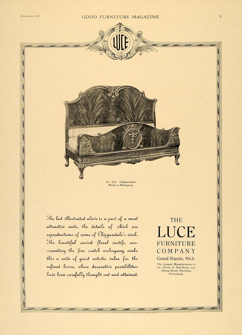 This is an original 1920 black and white print ad for the Luce Furniture Company, the largest manufacturers of bedroom and dinning room furniture, located in Grand Rapids, Michigan.