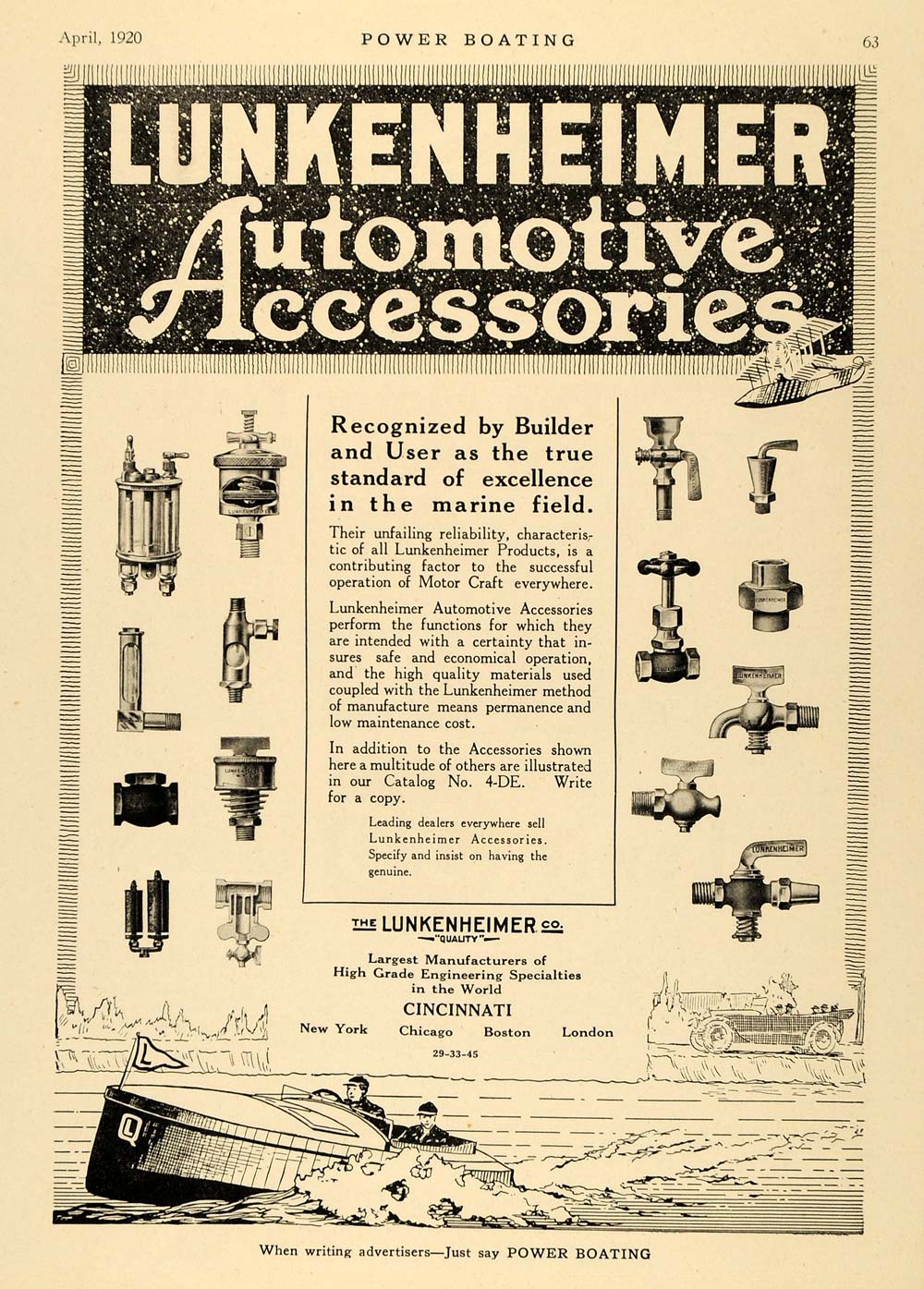This is an original 1920 black and white print ad for the Lukenheimer Company, the largest manufacturers of high grade engineering specialties in the world, located in Cincinnati, New York, Chicago, Boston, and London. This ad features their automotive marine accessories.