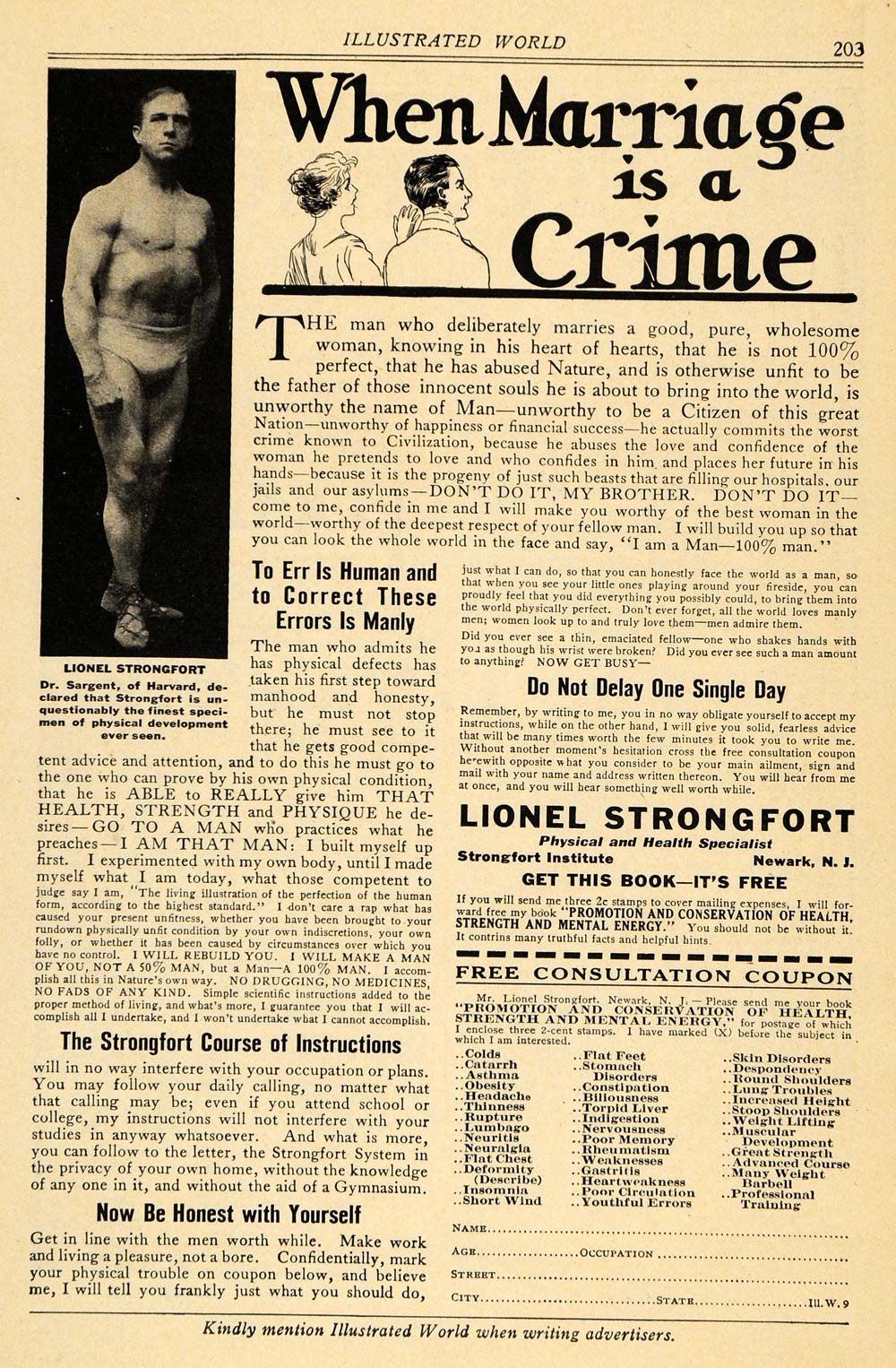 This is an original 1920 black and white print ad for Lionel Strongfort-- physical and health specialist. The ad writes, "The man who admits he has physical defects has taken his first step toward manhood and honesty..."