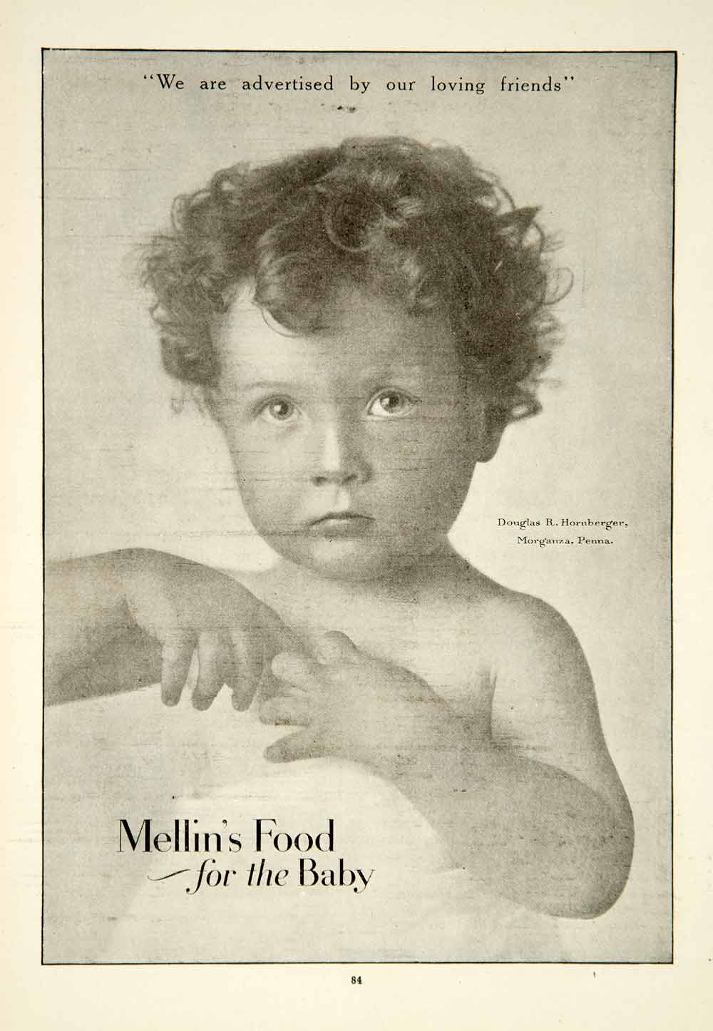 This is an original 1920 black and white print ad for Mellin's Baby Food, featuring Douglas R. Hornberger from Morganza, Pennsylvania.