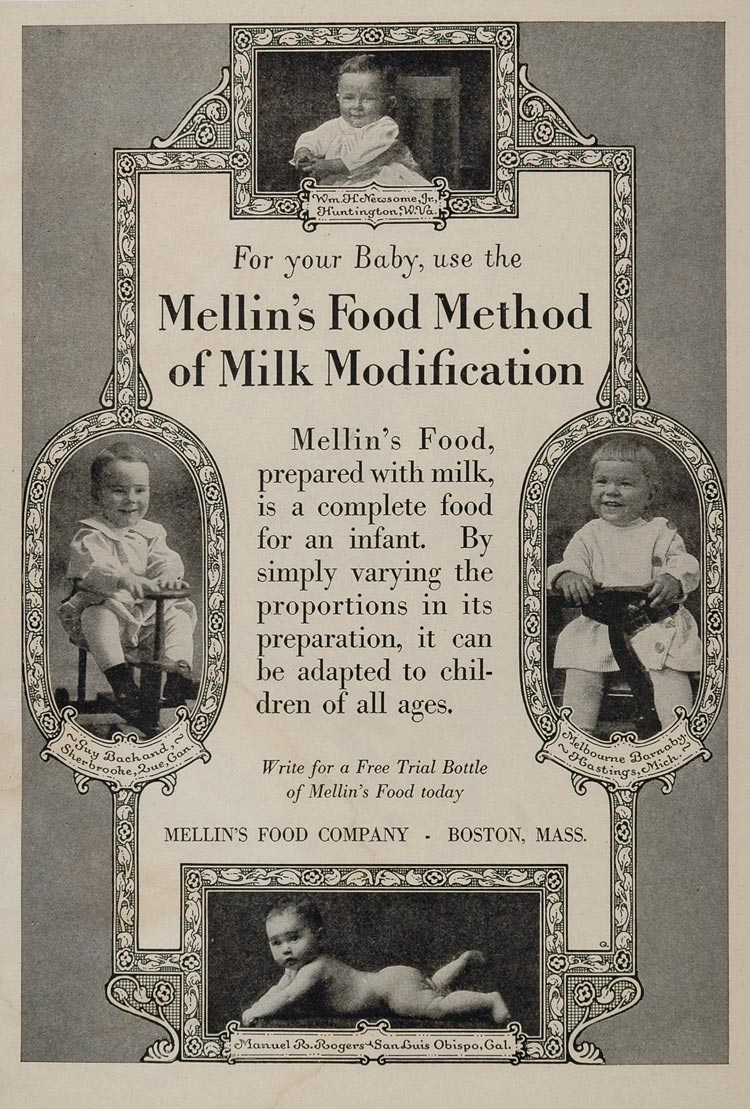 Mellin's Baby Food. Considering the difficulties some mothers had with breast-feeding, the fact that some infants could not properly digest fresh cowÕs milk, the time consuming burden of preparing and producing homemade baby food, as well as sanitation concerns surrounding infant mortality due to infected or sour milk, G. Mellin of London decided to join the few other companies that produced food for infants. However, unlike the others, Mellin created a food for babies and infants that needed very little preparation. MellinÕs Food was already boiled and strained and only needed a small amount of hot water and milk before it could be consumed. Theodore Metcalf & Company, located at 39 Tremont Street in Boston, Massachusetts, became the primary British and United States agents for MellinÕs Food. Between 1884 and 1906, Doliber-Goodale Company, located at 41 Central Wharf in Boston, Massachusetts, joined as an additional selling agent for MellinÕs Food.